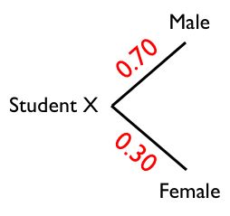 The question now becomes, how many of the students are Male and how many are Female? Well, the problem tells you that 70% of the students are male, which means that 30% are female. I like to illustrate that by writing those numbers, in decimal form (for easy multiplication, if necessary), on the branches of the tree, as follows: