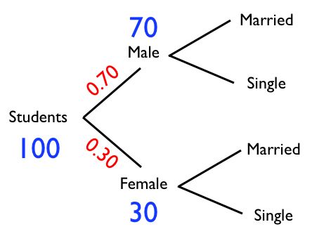 Now, we come to our second decision point and can draw the remaining branches on our probability tree. Whether a student is male or female, he/she is either married or single. There are four such permutations, illustrated this way: