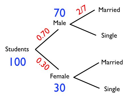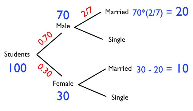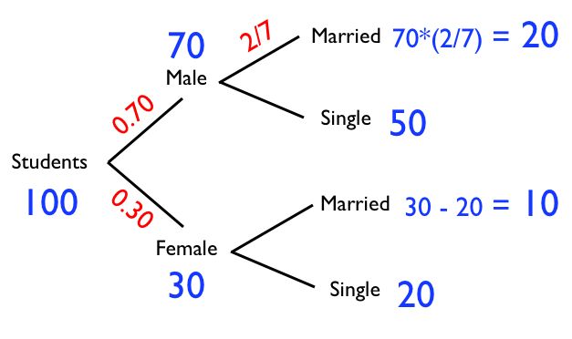 Once again, it’s time to do a little math to quantify exactly how many male students are married. Since we’ve already determined, based on our hypothetical 100 total students, that 70 are male, then 2/7 of those 70 male students is 20. So, you’d want to write “20” in the appropriate place on your probability tree: