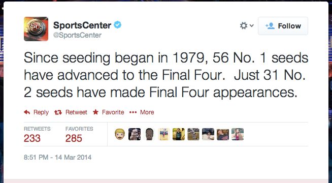 ESPN Analyst: All eyes will be on the NCAA Tournament committee when it releases the tournament bracket on Sunday. The top 8 teams will be particularly interested. After all, since seeding began in 1979, 56 No. 1 seeds have advanced to the Final Four. Just 31 No. 2 seeds have made Final Four appearances.